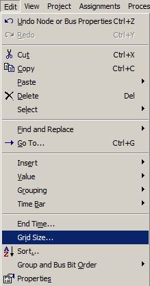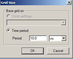 Особенностью редактора временных диаграмм является наличие в поле временных диаграмм вертикальных прерывистых линий серого цвета, следующих с определенным периодом. Это, так называемая, временная сетка (time grid). Для задания размера сетки следует вначале открыть файл с временными диаграммами, а затем воспользоваться меню Edit, в котором необходимо выбрать строку Grid Size, как показано на рис. 3.6.3.1. Далее в появившемся окне Grid Size необходимо задать нужную величину и нажать кнопку OK (см. рис. 3.6.3.2.).
