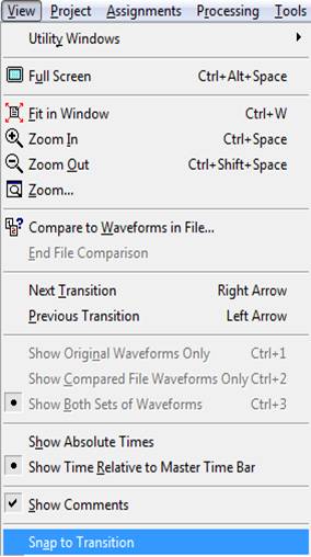 Границы интервалов также можно привязать к моментам времени, в которых осуществляются переходы, на имеющихся уже в поле временных диаграмм сигналах. Для этого надо воспользоватся меню View на панели инструментов менеджера проекта, и в открывшемся меню выполнить команду Snap to Transition (см. рис. 3.6.3.2.1.).