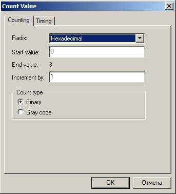 Задайте в этом окне на закладке Counting параметры счета, а именно: систему счисления, в которой будут представляться формируемые значения на шине, начальное значение, величину приращения и тип счета (двоичный или код Грея). На закладке Timing можно задать временные параметры изменяемого сигнала (см. рис. 3.6.4.3.2.).