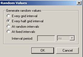 2. В этом окне задайте интервал изменения случайной величины. Он может совпадать с размером сетки, составлять половину размера сетки, может быть случайной величиной, а может быть величиной фиксированной. В этом случае длительность интервала задайте в окне Interval period. Задание величин значений сигналов или шин таких, как слабый ноль, слабая единица, не инициализировано, не важно, высокоимпедансного состояния и других, осуществляется аналогичным образом.