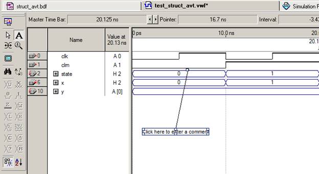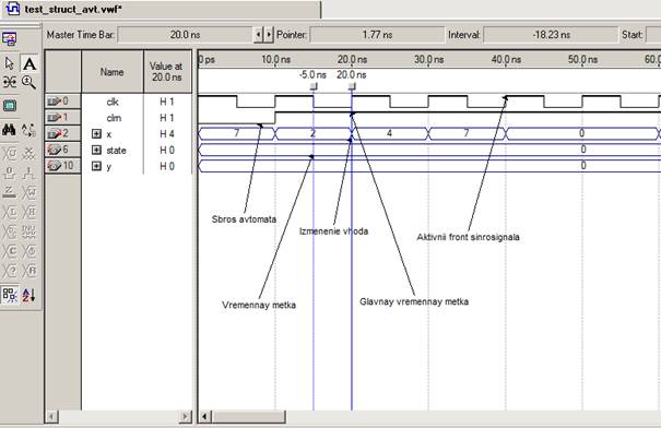 . Текстовая строка выделится рамкой синего цвета. Щелкните левой кнопкой мыши по выделенному тексту, и не отпуская кнопки «перетащите» текст в более подходящее место. При этом комментируемая позиция на временной диаграмме останется неизменной. Чтобы переместить саму комментируемую позицию на временной диаграмме, необходимо поступить аналогичным образом, а именно, вначале выделить её, а затем «перетащить». Пример подготовленных временных диаграмм для моделирования структурного автомата, рассмотренного ранее, приведен на рис. 3.6.5.3.