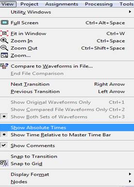 Чтобы настроить соответствующее отображение временной координаты, воспользуйтесь командой View из динамического меню менеджера проекта (см. рис. 3.6.6.2.). Выберите строку Show Absolute Times из выпадающего меню команды View, для использования координаты абсолютного времени, либо строку Show Time Relative to Master Time Bar для использования относительного смещения.
