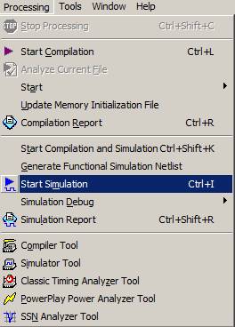 на панели инструментов менеджера проекта, либо в меню Processing выполните команду Start Simulation, как показано на рис 3.7.1. Также можно воспользоваться окном утилиты моделирования, в котором необходимо нажать кнопку Start, как было описано в разделе 3.2.