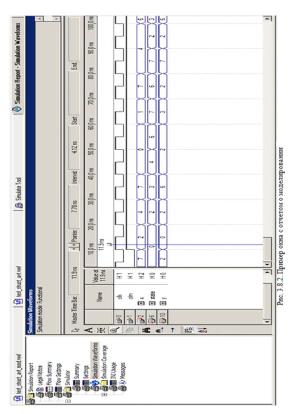 Внешний вид окна с отчетом и результатами моделирования структурного автомата, рассмотренного в разделе 2, приведен на рис 3.8.2.