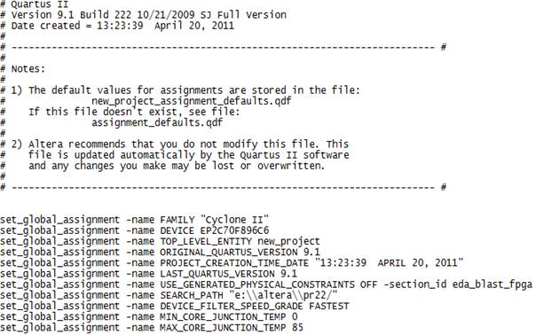 Он представляет собой текстовый файл, использующий синтаксис языка tcl. Поэтому файл .qsf можно редактировать в любом текстовом редакторе. При создании проекта пользователь может воспользоваться существующими в пакете Quartus II установками и назначениями, либо использовать их из ранее созданного проекта, либо выполнить свои собственные.