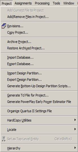 Для работы с проектом в менеджере проекта Quartus II используется команда Project, выпадающее меню которой приведено на рис. 1.2.3.