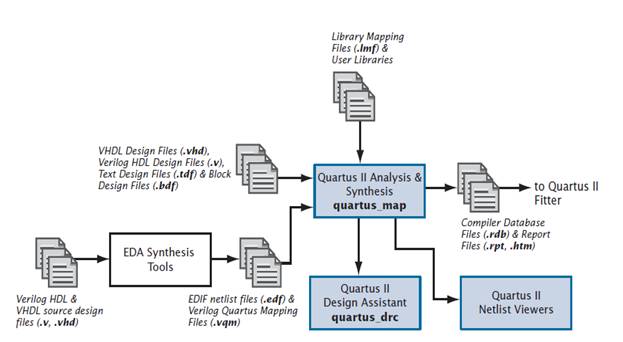 Пакет Quartus II допускает использование средств синтеза сторонних производителей САПР. В этом случае, созданные проектировщиком файлы описания проекта на языке VHDL или Verilog, должны быть преобразованы средствами синтеза в файл соединений в формате EDIF (.edf) или файл Verilog Quartus Mapping File (.vqm), которые затем могут быть использованы в пакете Quartus II (см. рис. 1.3.1.).