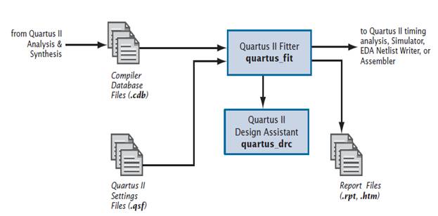 2.2. Размещение и трассировка. Модуль компилятора Quartus II, реализующий этот этап проектирования, называется Fitter. Он использует базу данных, созданную на предыдущем этапе модулем анализа и синтеза компилятора. Модуль Fitter осуществляет монтаж проекта в структуру выбранного кристалла программируемой логики. То есть, полученная на этапе синтеза модель полного представления проекта в техническом базисе кристалла отображается на внутренние ресурсы ПЛИС, которыми являются конфигурируемые логические блоки, блоки встроенной памяти, встроенные умножители и устанавливаются соответствующие соединения с помощью ресурсов трассировки кристалла. Модуль размещения и трассировки подбирает для каждой логической функции подходящее место на кристалле, с точки зрения уменьшения времени распространения сигнала, выполняет соответствующие соединения и назначения контактов ввода-вывода. Рис. 1.3.2. демонстрирует реализацию этапа размещения и трассировки. Исходными файлами для выполнения этапа являются файлы с расширением .cdb, созданные после выполнения синтеза компилятором и файлы с установками, имеющие расширение .qsf. На выходе получаются файлы отчета о компиляции (.rpt, .htm) и обновленная база данных [4].
