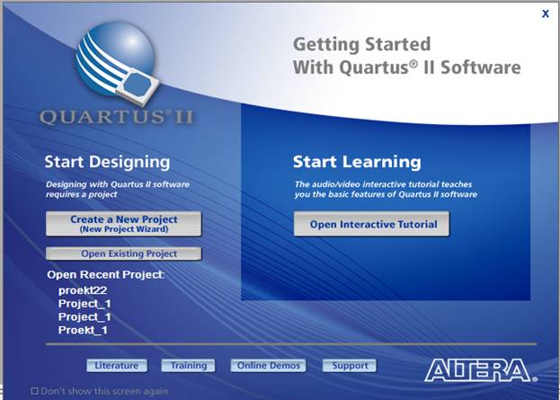 на рабочем столе Windows. Появится главное окно менеджера проекта Quartus II, на фоне которого будет помещена панель, с предложением либо пройти курс обучения, используя предложенное интерактивное руководство, либо открыть существующий проект, либо создать новый проект.