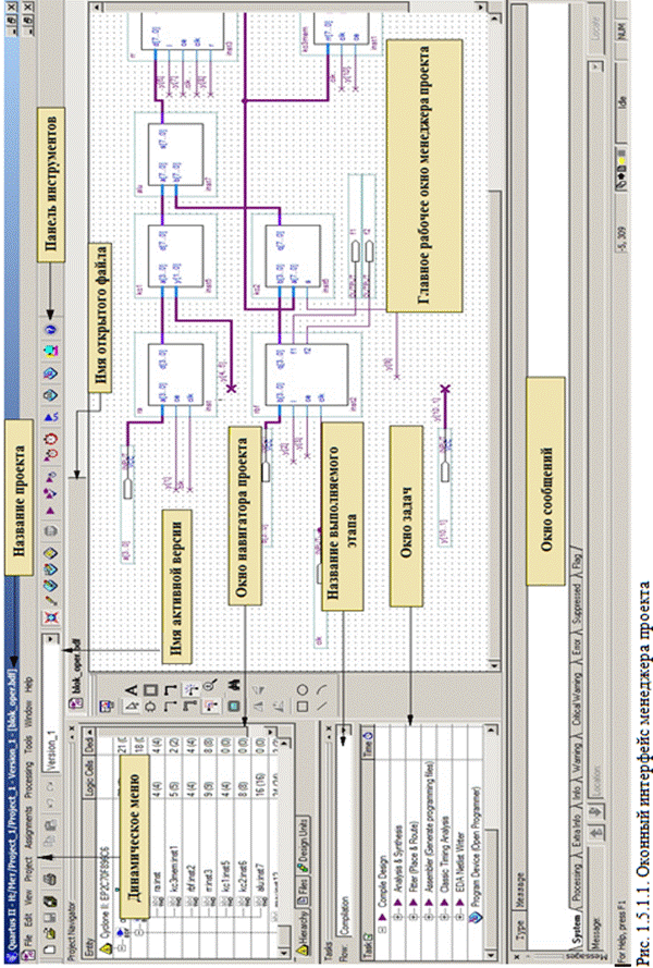Внешний вид графического пользовательского интерфейса пакета Quartus II показан на рис. 1.5.1.1. Иногда его называют оконным интерфейсом менеджера проекта.