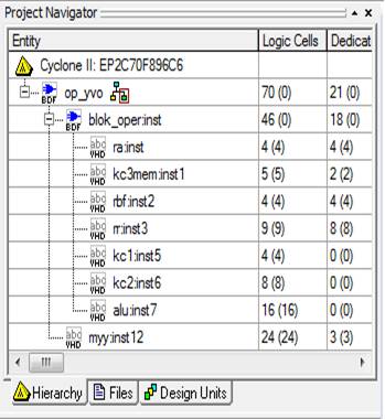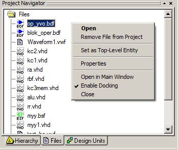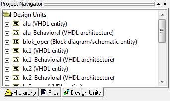 Окно навигатора проекта содержит страницы со следующими закладками: Hierarchy, Files, Design Units.