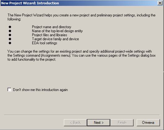 Для создания нового проекта используется утилита New Project Wizard (NPW). Чтобы её вызвать, выполните следующие шаги. Щелкните левой клавишей мыши по кнопке File на панели инструментов Quartus II. Затем в появившемся окне щелкните по строке New Project Wizard. Далее появится окно, представленное на рис. 1.6.1.