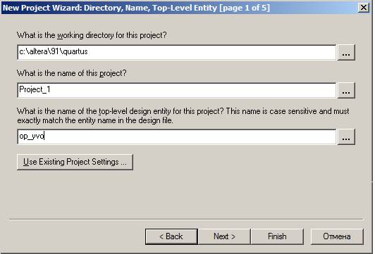 позволит воспользоваться браузером для задания вышеперечисленных параметров. Этап компиляции проекта всегда выполняется для модуля верхнего уровня. Поэтому, в случае необходимости, в последующем этот модуль может быть переопределен. На первой странице окна NPW имеется кнопка Use Existing Project Settings. С помощью этой кнопки пользователь может задать установки, которые будут использоваться по умолчанию в его новом проекте. Причем можно использовать установки либо из последнего открытого в Quartus II проекта, либо из указанного пользователем проекта.