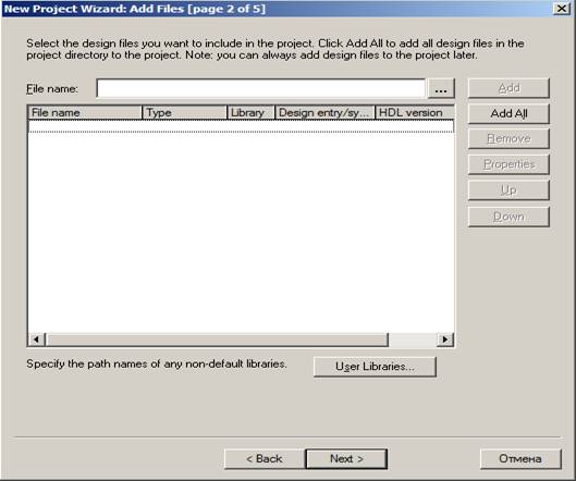 В рассматриваемом окне NPW с помощью кнопки User Libraries пользователь может добавить к проекту пользовательские библиотеки, содержащие файлы проекта на языках VHDL, Verilog, AHDL, файлы с определениями макрофункций, мегафункций и другие файлы проекта.