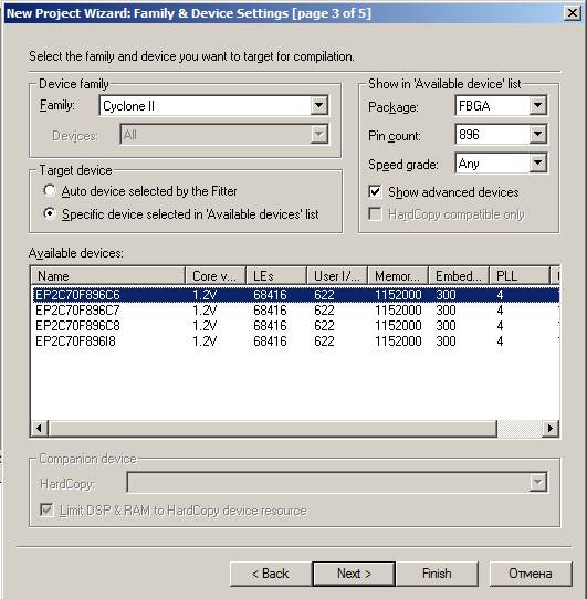 В этом окне пользователь выбирает ПЛИС, на которой будет реализован проект. Причем кристалл может быть выбран пользователем из предлагаемого списка, либо автоматически назначен компоновщиком. В случае выбора кристалла пользователем, следует вначале выбрать его семейство в окне Family, затем определить тип корпуса интегральной схемы в окне Package, в окне Pin Count указать количество выводов кристалла и в окне Speed grade указать градацию быстродействия кристалла. Затем остается выбрать подходящий кристалл из списка в окне Available Devices, и с помощью кнопки Next перейти к следующему окну [page 4] NPW, показанному на рис. 1.6.5. На рис. 1.6.4. приведен пример задания типа кристалла ПЛИС Cyclone EP2C70F896C6, который используется в учебном стенде DE 2-70 [8].