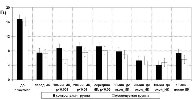 • с началом ИК значения частоты спектрального края в контрольной группе пациентов повышались, что говорит об уменьшении гипнотического компонента анестезии, т. е. снижении глубины сна, причем это различие статистически высокодостоверно (р<0,001);