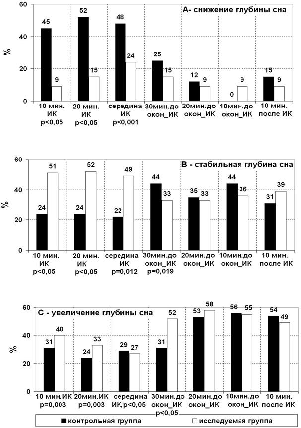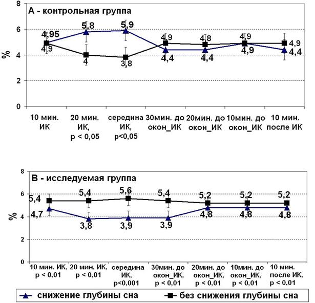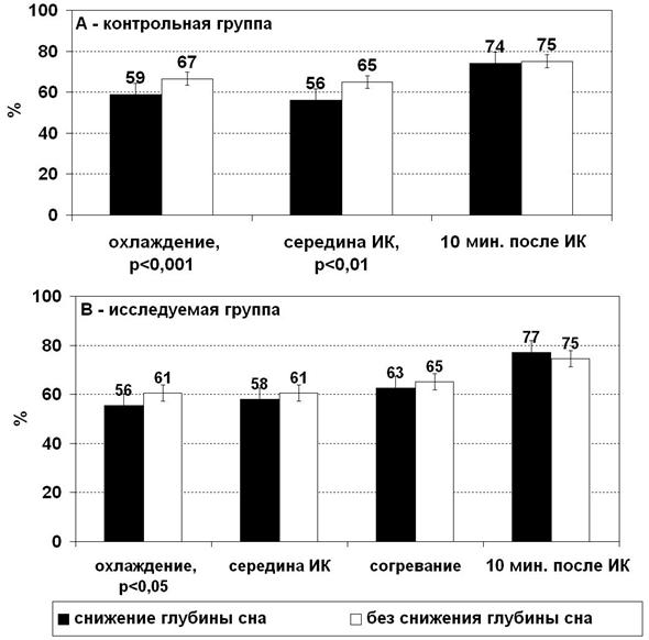 • во время начала ИК и в течение периода охлаждения у 45-52% пациентов в контрольной группе наблюдается снижение глубины сна. В исследуемой группе их доля уменьшилась до 9-15% (рис. 2-А);