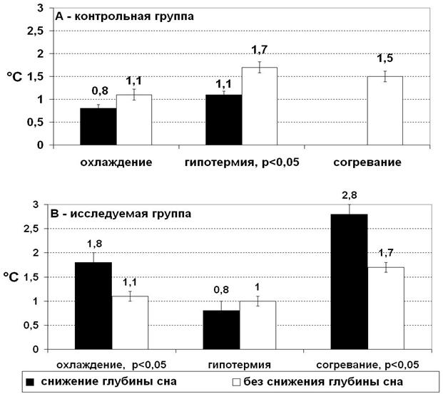 Рисунок 4. Градиент температур у пациентов с различной динамикой глубины сна: А – контрольная группа, В – исследуемая группа.