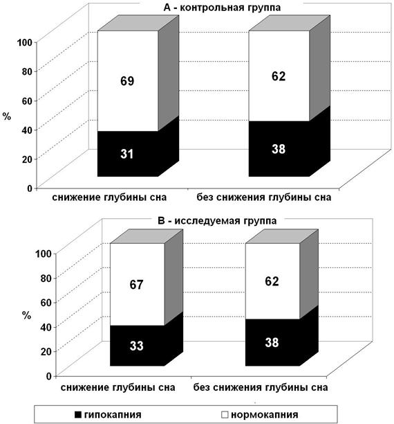 Для выявления влияния уровня РаСО2 на активность ЦНС мы сравнили количество пациентов с нормо - и гипокапнией отдельно среди пациентов со снижением глубины сна с началом ИК и среди тех, у кого начало ИК не сопровождалось снижением глубины сна. Гипокапнией считали уровень РаСО2 ≤ 32,0 мм рт ст, остальные пациенты были отнесены к группе с нормокапнией.