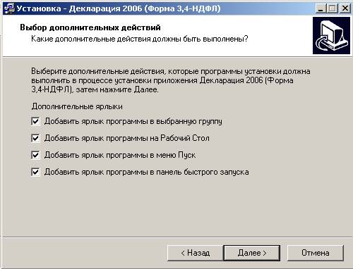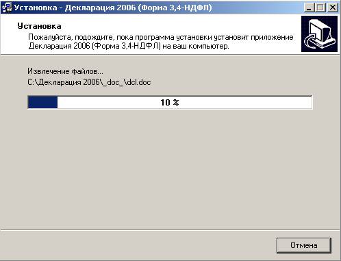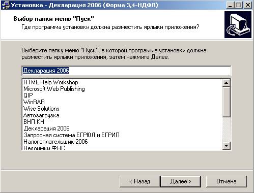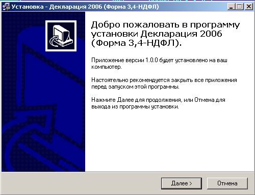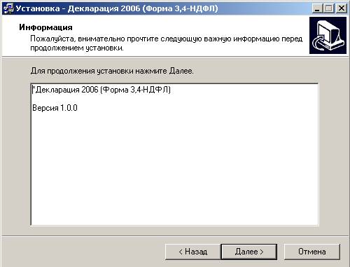 Если на компьютере уже имеется другая версия данной программы, то перед установкой новой версии необходимо удалить предыдущую (смотрите раздел Удаление приложения “Декларация 2006”)