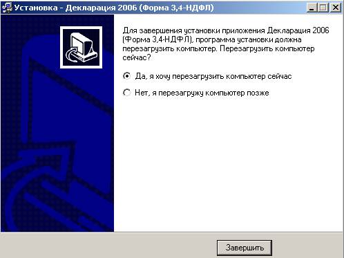 Программа Декларация 2006 установлена на ваш компьютер. Для завершения установки программы перезагрузите компьютер.