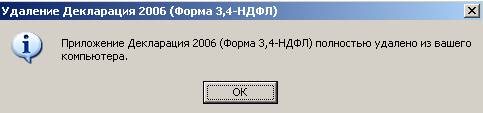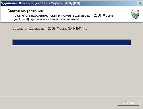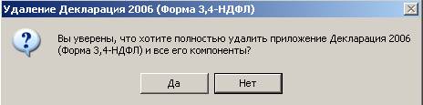 Запустить программу Удалить из меню Пуск -> Программы -> Декларация 2006, где вместо Декларация 2006 может быть иное, выбранное в процессе установки имя. Другой вариант – через панель управления (Пуск -> Настройка -> Панель Управления) и запустите апплет Установка и удаление программПосле одноного из выбранных действий на экране появится диалоговое окно, запрашивающее подтверждение на удаление приложения