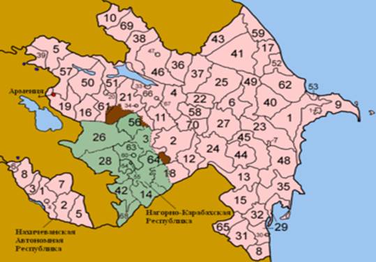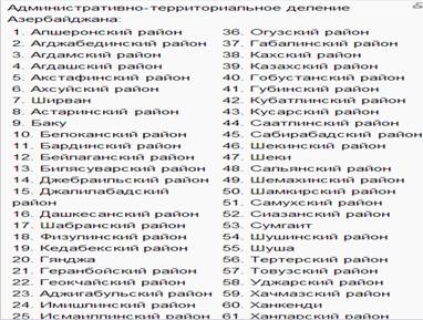 Административно территория Азербайджана делится на 66 районов (азерб. rayonlar), 12 городов республиканского подчинения (азерб. şəhərlər) и 1 автономную республику (азерб. muxtar respublika) — Нахичеванскую Автономную Республику. Деление на районы сохранилось с советских времен.