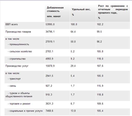 Общий объем производства продукции во всех отраслях экономики, где основная часть приходятся на промышленность (27,0 млрд. манатов или 50,0% от ВВП), сократился на 3,8%, и составил 34,8 млрд. манатов. В сфере услуг производство добавочной стоимости увеличилось на 7,6% и достигло 15,9 млрд. манатов.
