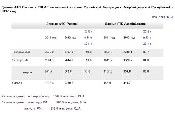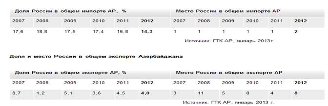 По итогам 2012 года российско – азербайджанский товарооборот составил 2338,3 млн. долл. США, что меньше на 17,3% по отношению к прошлому году. При этом экспорт в Россию уменьшился на 19,2% до 959,8 млн. долл. США, импорт из России снизился на 16,0% до 1378,5 млн. долл. США. Торговое сальдо составило отрицательное значение для Азербайджана – 418,7 млн. долл. США.