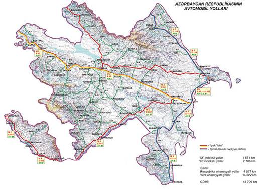 Общая протяжённость:км. Из нихкм с твердым покрытием. Департаментом «Йолнаглиййетсервис» (азерб. Yolnəqliyyatservis) Министерства транспорта Азербайджана, эксплуатируется и обслуживается 22134 км магистральных дорог страны. Из них 1684 км составляют международные магистрали, 2669 — стратегически важные, 13 тыс. км — местной важности, 1,5 км — на территории Баку, 3,3 тыс. км — на территории регионов. Общее число мостов на территории страны составляет 1201.