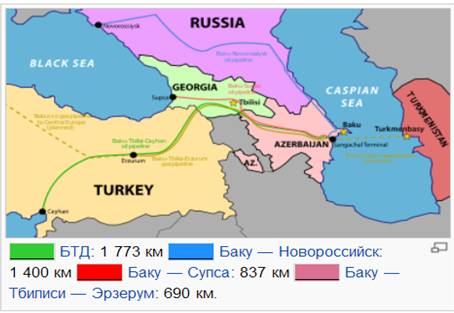 Нефтепровод Баку — Тбилиси — Джейхан — трубопровод для транспортировки каспийской нефти к турецкому порту Джейхан, расположенному на берегу Средиземного моря. Официальное торжественное открытие всего нефтепровода прошло 13 июля 2006 в Джейхане. Протяжённость 1773 километра (по территории Азербайджана (449 км), Грузии (235 км) и Турции (1059 км)). Проектная пропускная мощность — 50 миллионов тонн нефти в год, или один миллион баррелей в сутки. Стоимость — 3,6 млрд долларов.