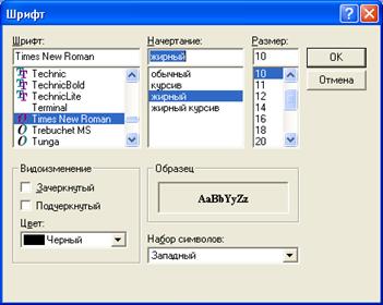 Модель примера 1 начинается с заголовка, выделенного жирным. В текстовом редакторе GPSS World по умолчанию используется шрифт Courier New. Данный шрифт облегчает выравнивание колонок текста модели и особенно стандартного отчета, так как все символы этого шрифта имеют одинаковую ширину. Однако этот шрифт можно изменить. Изменим его, например, дли заголовков сегментов модели. Выберем File ► Font (Файл ► Шрифт) и получим окно установки шрифта. Установим Times New Roman, жирный, 10 (рис. 5).