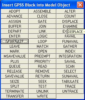 Выберем Edit ► Insert GPSS Blocks... (Правка ► Вставить блок GPSS...). В окне (рис.7) выберем GENERATE и щелкнем левой кнопкой мыши.