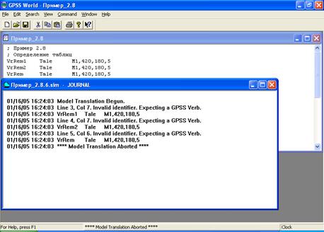 Однако чаще всего синтаксические ошибки в объекте «Модель» имеются. Предположим, что есть они и в модели Пример_1. Пусть при вводе третьем строки вместо Table набрано Tale и, поскольку следующие две строки (четвертая и пятая) были введены посредством копирования, эта ошибка оказалась и в них. Вследствие ошибок объект «Процесс моделирования» не может быть создан. В окне JOURNAL (Журнал) транслятор выдаст список сообщении об ошибках трансляции (рис. 13).