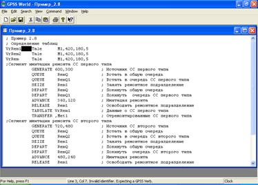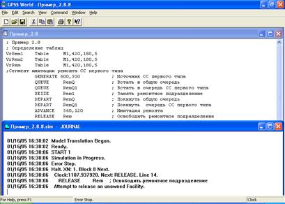 Сообщение указывает, что транзакт пытается освободить ОКУ, которое не было им занято, т. е. в блоке RELEASE в данной модели нужно было указать Reml, а не Rem. При останове по ошибке транслятор не создает список ошибок выполнения, подобный списку ошибок трансляции. Поэтому использовать команду Search ► Next Error нельзя. Строку с ошибкой нужно найти самостоятельно. Для этого следует воспользоваться командой Search