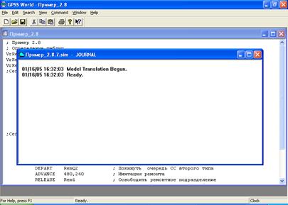 Объект «Процесс моделирования» представляет собой оттранслированный объект «Модель». Для трансляции объекта «Модель» необходимо выбрать Command ► Create Simulation (Команда ► Создать процесс моделирования) ([Ctrl]+[Alt]+[S]). По этой команде транслятор GPSS проверяет модель на наличие синтаксических ошибок. При отсутствии синтаксических ошибок транслятор активизирует все интерактивные команды и окна для того, чтобы можно было следить за состоянием процесса моделирования и управления им.