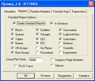 Отчет может настраиваться. Откройте модель Пример_1. Выберите Edit ► Settings (Правка ► Настройки) Перейдите на страницу Reports (отчеты) (рис. 18). Вы увидите перечень объектов GPSS, данные о которых по умолчанию включаются в отчет. По желанию пользователя перечень объектов можно изменить, сняв или установив соответствующие флажки.