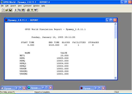 По окончании работы модели система автоматически создает отчет. Статистическая информация выводится только о тех объектах, которые присутствуют в модели. В общем же стандартный отчет содержит кроме общей характеристики модели следующие сведения: