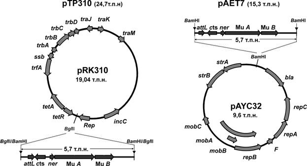 Рис. 1. Схема конструирования и физико-генетическая карта хелперных плазмид pTP310 и pAET7.