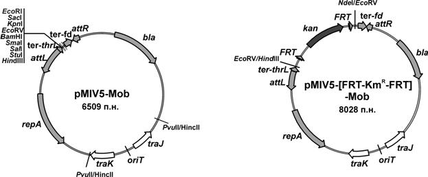 Для создания мобилизуемого интегративного вектора была использована плазмида – pMIV5 ( и др., 2008). Эта плазмида с репликоном pSC101 была сконструирована в АГРИ ранее в результате интеграции mini-Mu MD4041 в pMW1 ( и др., 2007) с последующим удалением практически всей внутренней части исходного транспозона между Mu-attL и Mu-attR и встраиванием некоторых терминаторов транскрипции и последовательности полилинкера. Дальнейшая модификация этой плазмиды была связана с обеспечением возможности ее мобилизационного переноса в клетки M. methylotrophus.