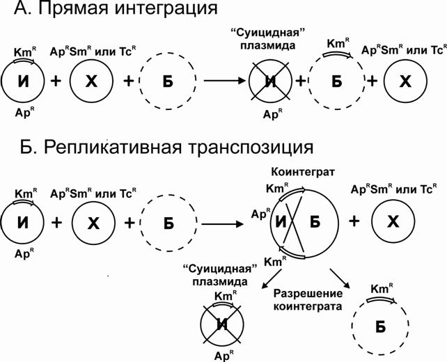 Рис. 3. Схема прямой интеграции (А) и репликативной транспозиции (Б) mini-Mu-транспозона, содержащего KmR-маркер (обозначен стрелкой), из нереплицирующегося в клетках M. methylotrophus AS1 интегративного вектора (И) в бактериальную хромосому (Б) в присутствии хелперных плазмид (Х), имеющих в своем составе различные маркеры устойчивости к антибиотикам: ApR, SmR или TcR.