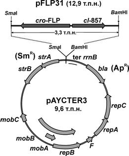 Для демонстрации такой возможности в клетках M. methylotrophus первоначально было осуществлено конструирование плазмиды pFLP31 (Рис. 4). Фрагмент ДНК, содержащий ген FLP-рекомбиназы дрожжей S. cerevisiae, а также ген термочувствительного репрессора lcIts857 и способный обеспечить в бактериальных клетках регулируемую экспрессию гена FLP-рекомбиназы за счет транскрипции с промотора PR бактериофага l, был переклонирован из плазмиды pCP20 (Datsenko K. and Wanner B., 2000) в состав вектора широкого круга микроорганизмов pAYCTER3 (ApR, IncQ).