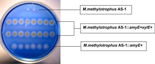 Первым в хромосому M. methylotrophus был итегрирован ген amyE B. amyloliquefaciens (Smirnova N. et al, 1988), экспрессия которого детектировалась по зонам гидролиза крахмалосодержащей среды вокруг соответствующих клонов (Рис. 5). Затем после FLP-зависимого удаления маркера KmR удалось с высокой эффективностью селективно интегрировать в Amy+-варианты M. methylotrophus AS1::amyE mini-Mu транспозон, содержащий xylE ген P. putida mt-2 (Inouye, S. et al, 1981). Катехол 2,3-диоксигеназа (С23О) катализирует расщепление катехола до полуальдегида мукановой кислоты, раствор которой имеет интенсивно желтый цвет. Поэтому экспрессия в бактериальных клетках гена xylE легко регистрируется (Zukowski, M. et al, 1983). Экспрессия обоих генов в двойном мутанте M. methylotrophus AS1::amyE+xylE+ была подтверждена экспериментально (Рис. 5).
