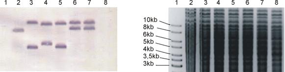 Рис. 6. Результаты ДНК-гибридизации по Саузерну клонов M. methylotrophus AS1, содержащих в хромосоме копии mini-Mu транспозона {[FRT-KmR-FRT]-SmR}. Изолированная из клеток хромосомная ДНК была гидролизована нуклеазой EcoRV, полученные в результате фрагменты ДНК разделены с помощью электрофореза в агарозном геле (Б) и гибридизованы с меченым зондом (А): дорожка 1 – маркер, дорожка 2 – контроль – клон M. methylotrophus AS1::{[FRT-KmR-FRT]-SmR}, отобранный в результате первичной интеграции mini-Mu в хромосому (устойчивость к SmR – 500 мг/л), дорожки 3 - 7 – клоны M. methylotrophus AS1::{[FRT-KmR-FRT]-SmR}, отобранные после процедуры амплификации mini-Mu в хромосоме (устойчивость к SmR – 2 г/л), дорожка 8 – отрицательный контроль – M. methylotrophus AS1 (дикий тип).