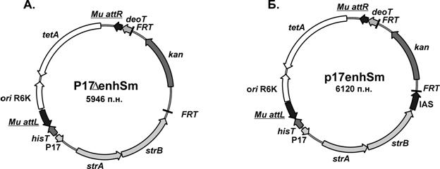 Структура генетического элемента mini-Mu одного из вновь сконструированных векторов p17DenhSm была аналогична ранее используемым интегративным векторам (Рис. 7 А), а в состав mini-Mu транспозона второго p17enhSm был клонирован фрагмент ДНК размером 350 пар нуклеотидов, содержащий энхансерную последовательность бактериофага Mu (IAS) (Рис. 7 Б). В качестве внутренних селективных маркеров mini-Mu как и в предыдущих экспериментах были использованы: ген устойчивости к Km, по которому проводили отбор первичной интеграции, и гены strAB, позволяющие регистрировать амплификацию mini-Mu в хромосоме.