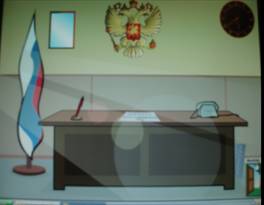 При открытии пособия ученик попадает в деловой кабинет. При наведении курсора на ряд объектов кабинета всплывают гиперссылки-подсказки, позволяющие изучить историю государственной символики России и её современное содержание.