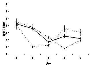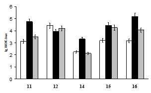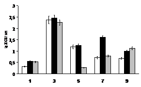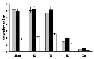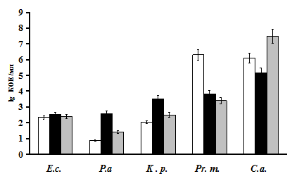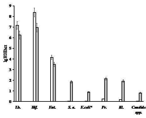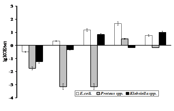 У всех крыс, получавших молочнокислые закваски, отмечалось более быстрое, по сравнению с животными контрольных групп, восстановление аппетита, нормализация стула и увеличение массы тела. Бактериологические исследования фекалий крыс, после воздействия пробиотическими заквасками с E. faecium L5, свидетельствовало о быстрой колонизации кишечника крыс генетически маркированными энтерококками. Это приводило к полной элиминации протея, клебсиелл, золотистых стафилококков и лактозонегативных или гемолитических эшерихий. Следует отметить, что при сравнении эффектов воздействии различных LAB на микрофлору кишечника крыс с дисбиозом выявлены существенные различия. Как видно на рис. 7., при введении молочнокислых заквасок с L. fermentum Z уменьшение числа клебсиелл происходило в меньшей степени, а при использовании индигенных энтерококков - даже увеличивалось. В то же время, указанные культуры молочнокислых бактерий способствовали более активной элиминации протея из кишечника животных.