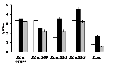 Антибактериальная активность супернатантов всех лактобацилл, полученных при их культивировании в бульоне МРС1, была больше, чем у супернатантов энтерококков, выращенных на этой среде. Она проявлялась существенным замедлением скорости роста индикаторных культур (L. monocytogenes, S. agalactiae, S. pyogenes) в фазу адаптации. Различия в проявлении антибактериальной активности были обнаружены только при определении минимальных ингибирующих разведений супернатантов, что явилось новым критерием для сравнения близких по антимикробной активности культур антагонистов. Показано, что все исследованные LAB не продуцировали перекись водорода, не имели существенных различий в продукции молочной кислоты и интенсивности подкислении среды при культивировании.