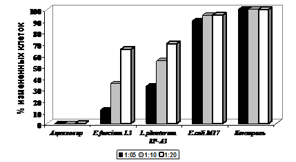 Влияние супернатантов различных пробиотических культур на выраженность ЦПД вирусов оценивали, сравнивая количество измененных клеток при внесении потенциальных ингибиторов репродукции ВПГ-1 за 90 мин до инфицирования культуры клеток. Как показано на рис.5., вирусы одни или в присутствии супернатанта эшерихий вызывали существенное ЦПД с поражением 95-100% клеток. Добавление ацикловира полностью защищало клетки Vero от влияния ВПГ-1. Супернатанты энтерококков и лактобацилл в разведениях 1:5 ингибировали ЦПД на 30 и 88 %. Супернатанты штаммов E. faecium L3 и L. plantarum 8P-A3 действовали в больших разведениях (до 20 раз), однако эффект уменьшался по мере снижения концентрации метаболитов этих бактерий. Наиболее выраженное антивирусное действие оказывали факторы, содержащиеся в супернатанте энтерококков. В данном случае при использовании максимальной нетоксичной концентрации препарата существенно (в 10-100 раз) повышалась максимальная инфекционная доза вируса. Также ингибировал репродукцию ВПГ-1 и пептидный экстракт, полученный из супернатанта культуры E. faecium L3. Однако синтетический энтероцин В и его аналог В1 в относительно высоких концентрациях до 0,5 мг/мл не оказывал противовирусного эффекта.