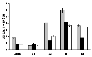 Статистически достоверных различий в уровне содержания иммуноглобулинов (IgA, IgM, IgG) сыворотки крови и слизи кишечника крыс выявлено не было. На 14 день исследований выявлена большая активность С3 фракции системы комплемента сыворотки крови животных, получавших пробиотические закваски, по сравнению контрольными группами. При этом, значения показателя Тlag, время до начала гемолиза, в группах крыс, которым внутрижелудочно вводили эшерихии и энтерококки (43± 13,1 с и 45,8 ±6,9 с), были меньше (р<0,05), чем у интактных животных и получавших молоко (56,7± 15,5 с и 57,1 ±17,8 с). При исследовании биоптатов слизистой кишечника крыс различных групп на 7 и 14 дни эксперимента не было обнаружено существенных различий уровнях экспрессии мРНК IL-1β, IL-8, IL-18 и TLR2 рецепторов. Однако выявлены, индивидуальные особенности пробиотических бактерий при их введении здоровым крысам в течение 7 дней. Так штамм E. faecium L5 в отличие от E.coli M17 вызывал экспрессию мРНК провоспалительного цитокина IL-10.